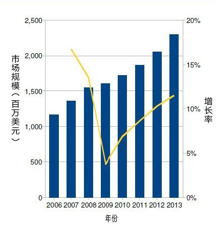 根據估算,全球民用安防市場將從2011年的200億美元增長到2017年的340億美元,在2011和2012年美國所占全球安防市場份額達到55%以上。